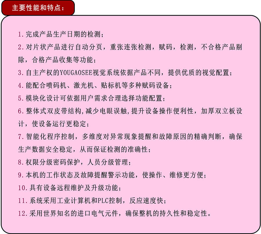 日期檢測功能特點詳解: 通過字符識別技術(shù)(OCR)檢測產(chǎn)品上的三期信息是否合格。 可檢測漏打碼、字符殘缺、模糊、重碼、偏移、內(nèi)容錯誤等噴碼缺陷。 支持激光打碼、墨水噴碼、碳帶打印等多種打碼方式的檢測應(yīng)用。 安裝在客戶生產(chǎn)線上,在線檢測。并自動剔除不合格產(chǎn)品。 可存儲多組檢測參數(shù),換產(chǎn)時可直接調(diào)用,可快速完成切換產(chǎn)品操作。 該檢測系統(tǒng)廣泛應(yīng)用在醫(yī)藥、食品、日化、化工等行業(yè)。包括標(biāo)簽打碼、外箱噴碼、瓶子噴碼等標(biāo)識的檢測。對每個產(chǎn)品打碼的效果進行檢驗,有效的避免消費者對貴司產(chǎn)品品牌形象的不良影響。 拓展應(yīng)用: 支持日期內(nèi)容自動同步系統(tǒng)時間功能。減少人工設(shè)置操作。 支持與客戶系統(tǒng)對接。從客戶服務(wù)器獲取對比數(shù)據(jù)。從而自動設(shè)置檢測參數(shù)。無需人工干預(yù)。 支持噴碼背景有多種顏色的應(yīng)用場合?蛇x用彩色光源。保證圖像拍照效果最佳。切換相機方案時,光源顏色同時自動切換。 |